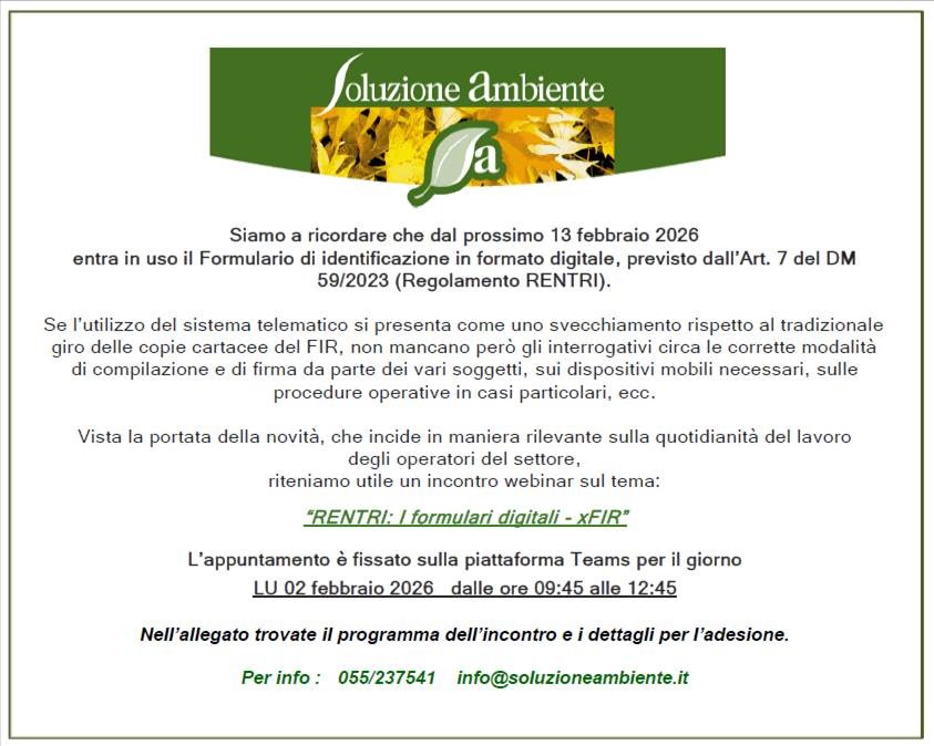 Soluzione Ambiente srl organizza in data 02/02/2026 un webinar informativo rivolto a tutte le aziende che producono, trasportano o gestiscono rifiuti.